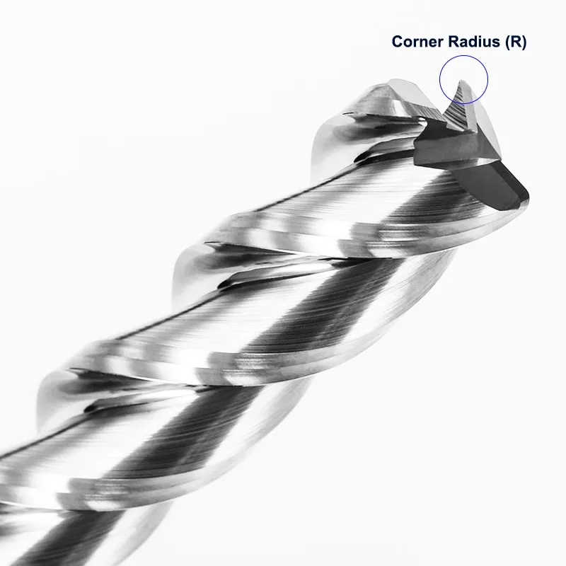 The "Bull Nose" geometry (Corner Radius) provides greater corner strength compared to square end mills, preventing chipping and extending tool life, while producing a superior surface finish compared to ball nose mills on flat surfaces. It is ideal for slotting, profiling, and ramping operations in CNC manufacturing.